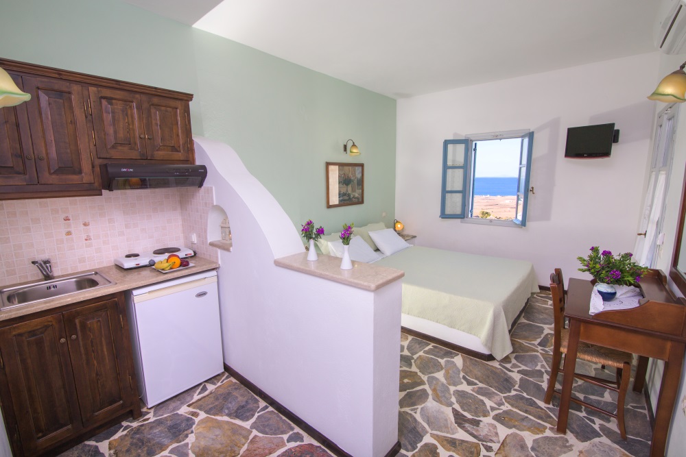 All studios are fully equipped with kitchenette (cooking and coffee utensils, mini fridge), private bathroom with shower (cosmetics) and hairdryer, TV(satellite channels), individual a/c unit (heat and cold), safe-box
